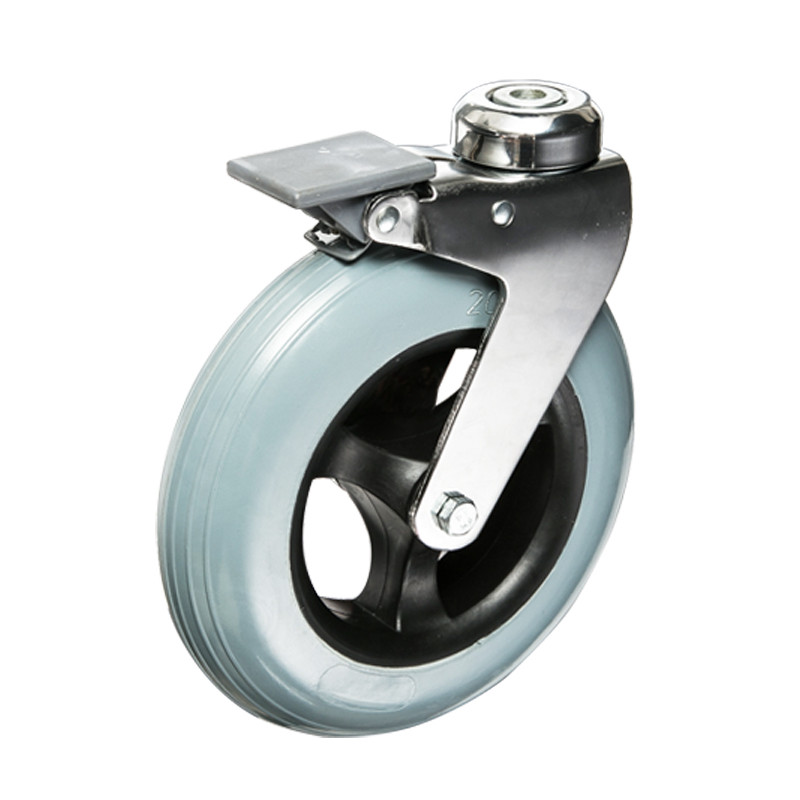 Zestaw kołowy obrotowy z hamulcem totalnym, wysokiej jakości piasta koła z czarnego polipropylenu, bieżnik z miękkiej pianki poliuretanowej, odporne na przebicie, ścieranie, uderzenia i korozję precyzyjne podwójne łożysko kulkowe, średnica koła 200 mm, widelec ze stali chromowanej, precyzyjne łożysko kulkowe w głowicy widelca, mocowanie na otwór M12.