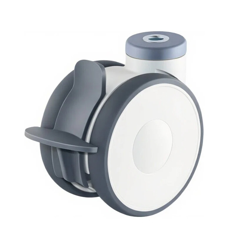 Obudowa z tworzywa PA6, łożysko kulkowe w głowicy widelca, obręcz kół wykonana z polipropylenu w kolorze białym / bieżnik z termoplastycznej gumy 85° Shore A szara, szerokość w piaście 82 mm, łożysko kulkowe pełna osłona z tworzywa sztucznego.