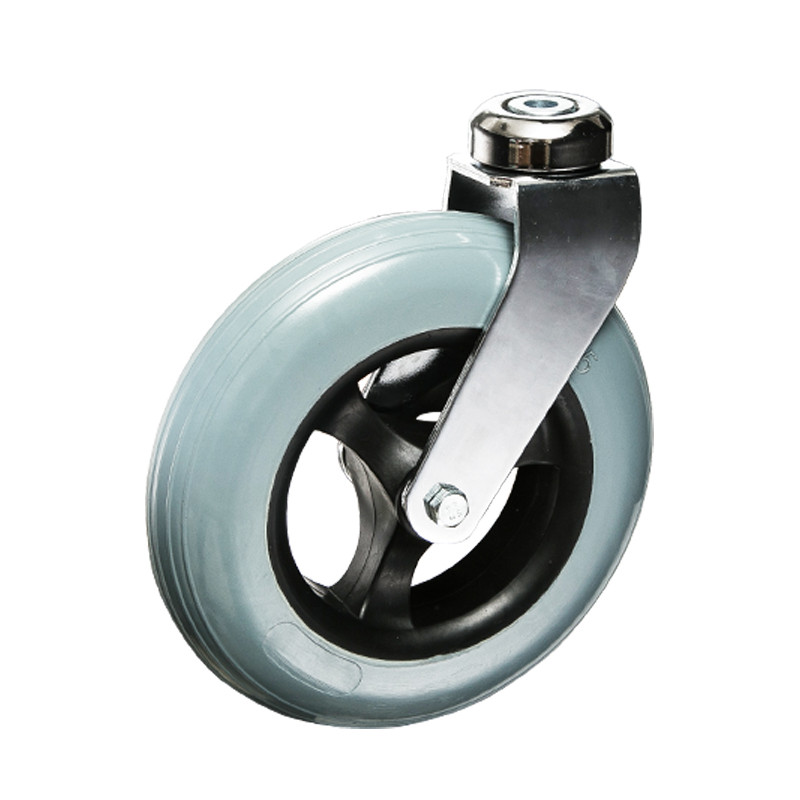 Zestaw kołowy obrotowy, wysokiej jakości piasta koła z czarnego polipropylenu, bieżnik z miękkiej pianki poliuretanowej, odporne na przebicie, ścieranie, uderzenia i korozję precyzyjne podwójne łożysko kulkowe, średnica koła 200 mm, widelec ze stali chromowanej, precyzyjne łożysko kulkowe w głowicy widelca, mocowanie na otwór M12.